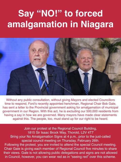 Join our protest at the Regional Council Building, 1815 Sir Isaac Brock Way, Thorold. Bring your “No Amalgamation Signs” at 4 p.m., prior to the just-called special council meeting on Thursday, February
