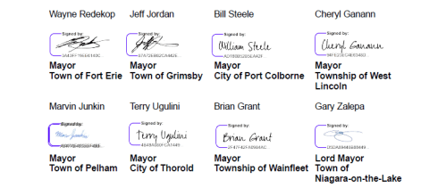 The Mayors of Fort Erie, Grimsby, Port Colborne, West Lincoln, Pelham, Thorold, Wainfleet, and the Lord Mayor of Niagara-on-the-Lake.