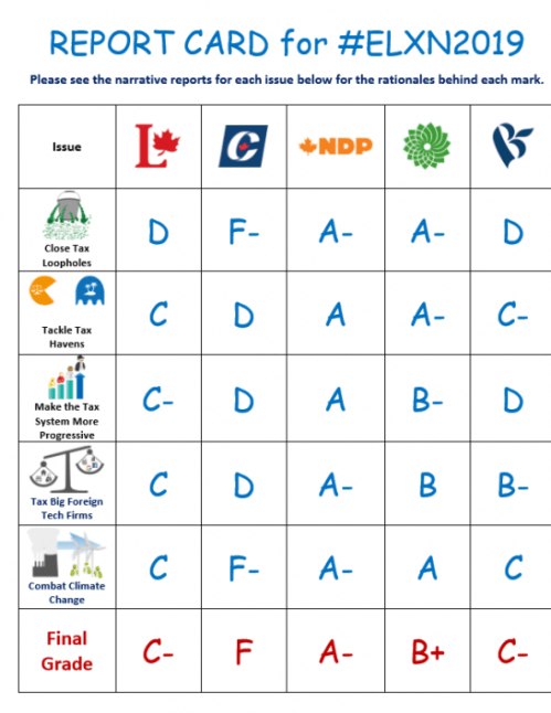 “The NDP is tops with an overall mark of A- for producing one of the mostprogressive platforms in decades, with the best plans to close taxloopholes, tackle tax havens, make the tax system more progressive andlevel the digital playing field by taxing foreign e-commerce giants.”