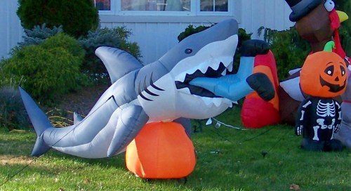 And here is one of the best big Halloween balloons I spotted a few days ago on a front land near Chippawa Park in Welland. The shark actually thrashes back and forth as it devours, head first, one of the characters in the 1970s Jaws movie –